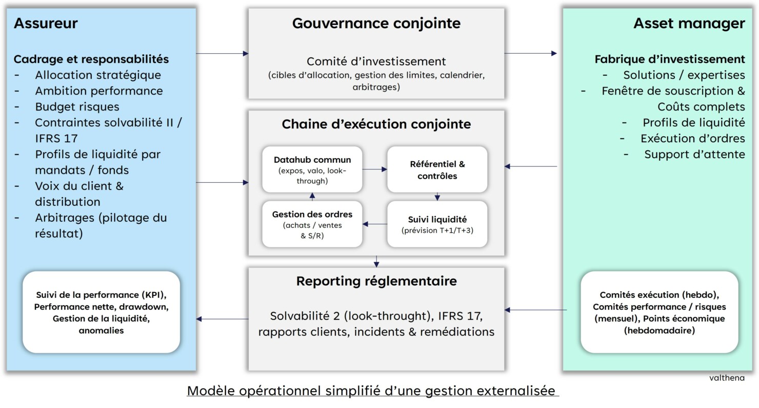 - Les compétences internes doivent permettre de couvrir l’ALM, la gestion taux/crédit, gestion actions / alternatives, la trésorerie/marge, l’exécution, la data et la conformité SII/IFRS.