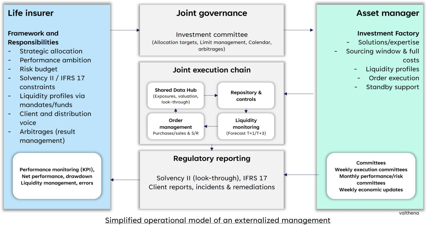 Three operational models structure this choice: fully internalized management, outsourcing via mandates, and a mixed model. In all cases, the operational model must function as an agile execution mechanism, supported by clear governance and robust “data” architecture.