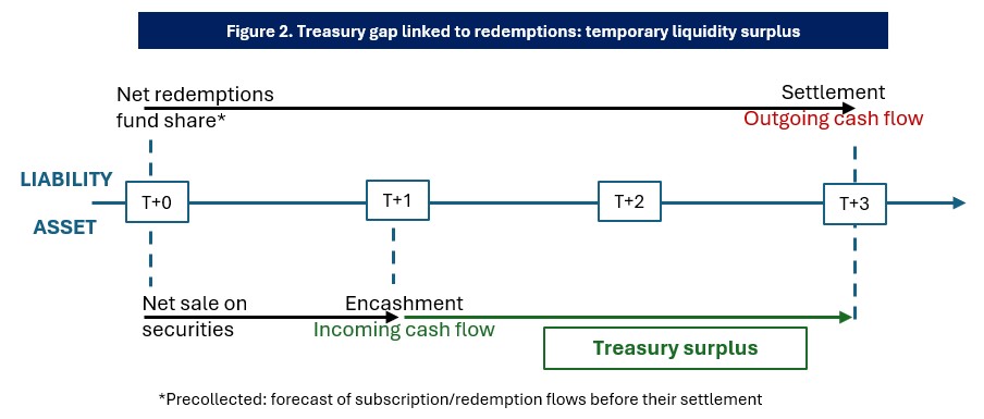 The gap between flows from securities transactions and those from share subscriptions or redemptions can generate either a prefinancing need (in case of subscriptions) or a temporary liquidity surplus (in case of redemptions). Faced with this asymmetry, two approaches emerge for asset management companies.